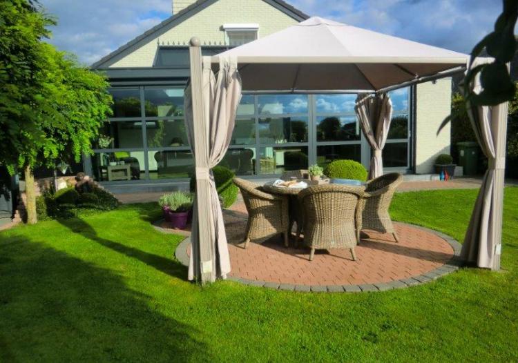 | Tuintekst | Zonnige aangelegde tuin + terras + pagode + werkplaats |